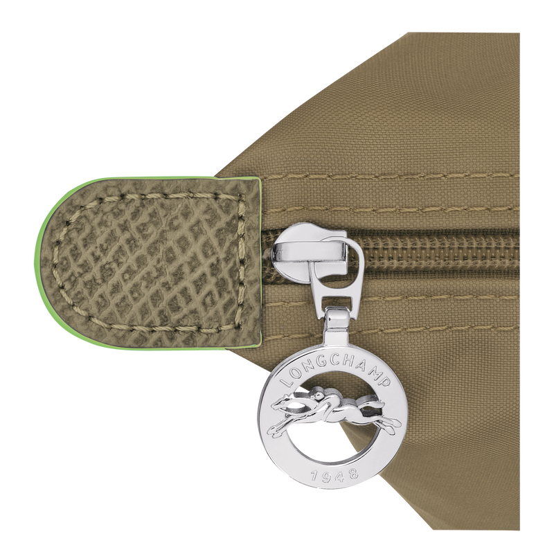 Reference : L1621919M04,Dimensions : 9.1 in (L – measured at the base of the bag) x 8.7 in (H) x 5.5 in (W),Material : Polyamide fabric with a minimum of 70% recycled fibers, with interior coating,,Metallic Hardware : Silver color,Trimming : Russian leather (cowhide),Weight : 0.43 lb,Closing : Zipper and snap closure